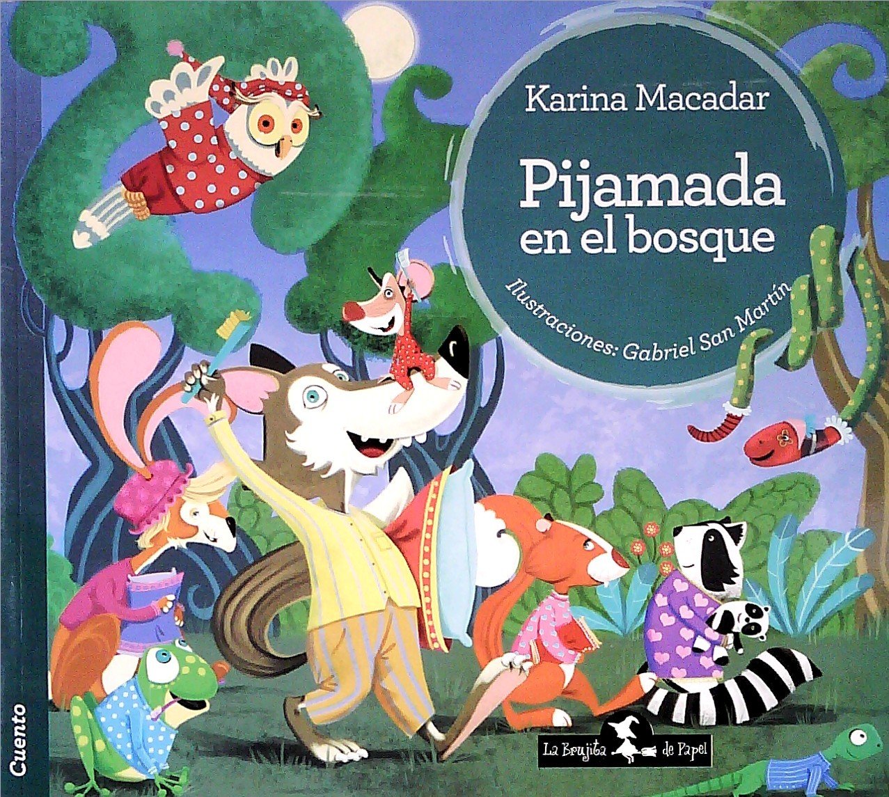 Esta es la historia de un lobo, un búho, una liebre, un sapo, una serpiente, una lagartija y un saltamontes que asistieron a la primera pijamada del bosque. Pero antes de que esta pijamada tuviera lugar ocurrieron muchas cosas: como una gran tormenta que hizo que el lobo gris invitara al señor búho a dormir a su guarida porque como a muchos de nosotros, no le gustaba dormir solo bajo el rezongo de los truenos. Y resulta que esa primera noche el lobo habló en sueños y el búho escuchó su secreto…